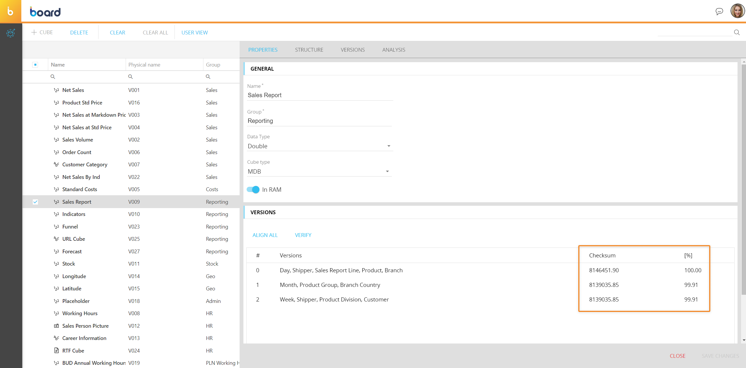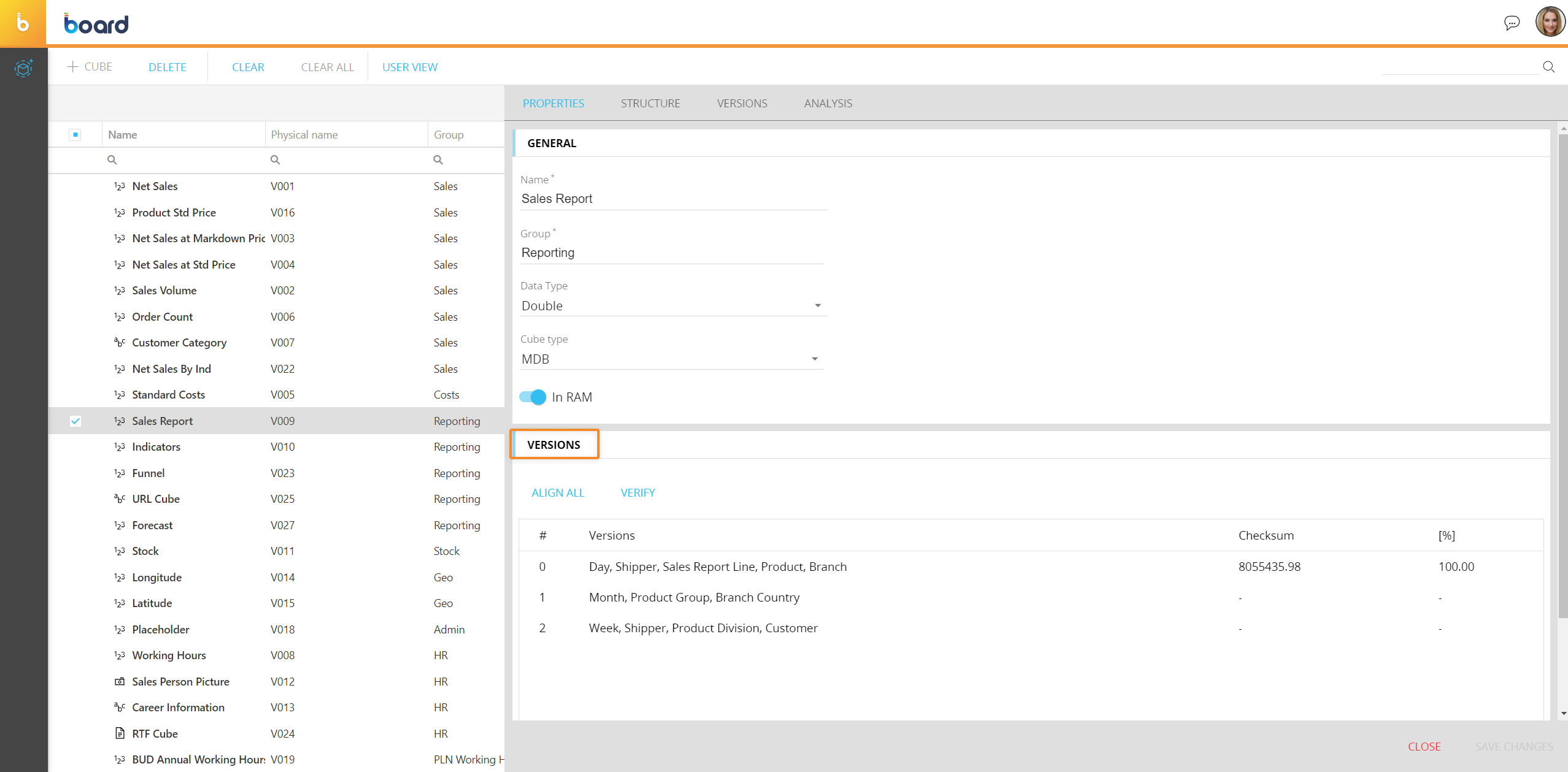 All versions of a Cube must contain the same data. This ensures that reports display consistent data regardless of the version used to create it. When data is loaded through a Data reader, the system automatically feeds all existing versions of the same Cube with said data, but when a new version is created and the Cube already contains some data, the new version must be aligned.