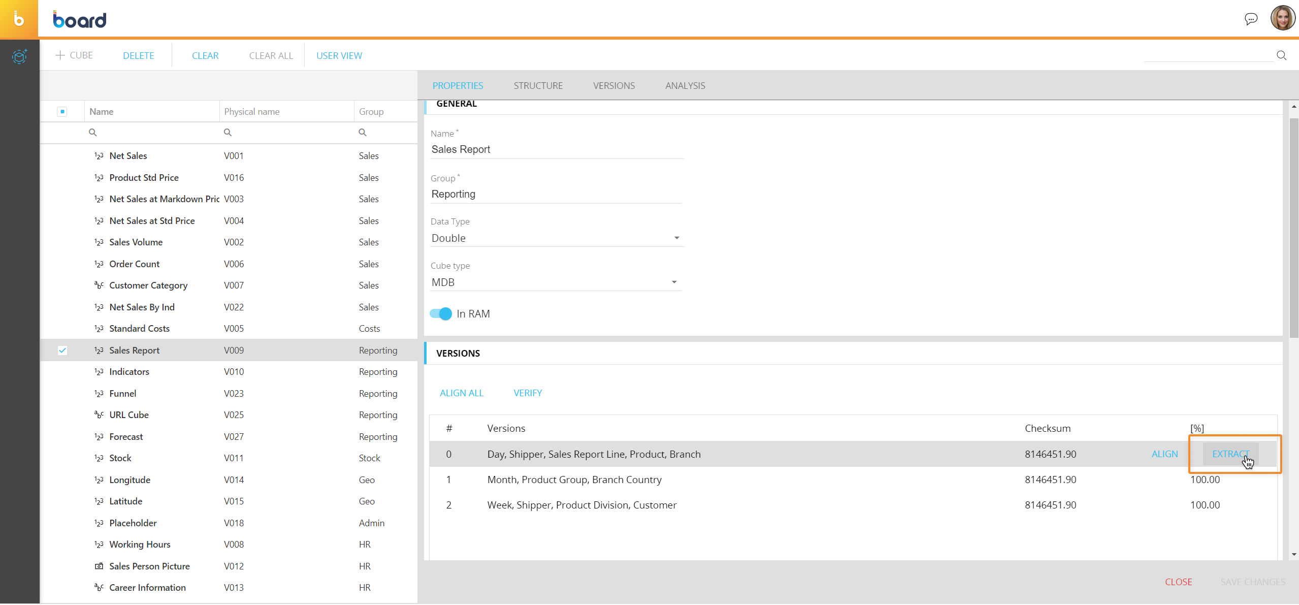 Board will export a file named after the Physical name of the Cube and the extracted version to the default extraction path (z:\). For example, clicking on the button in the image above would extract a file named "V0090001.csv".
