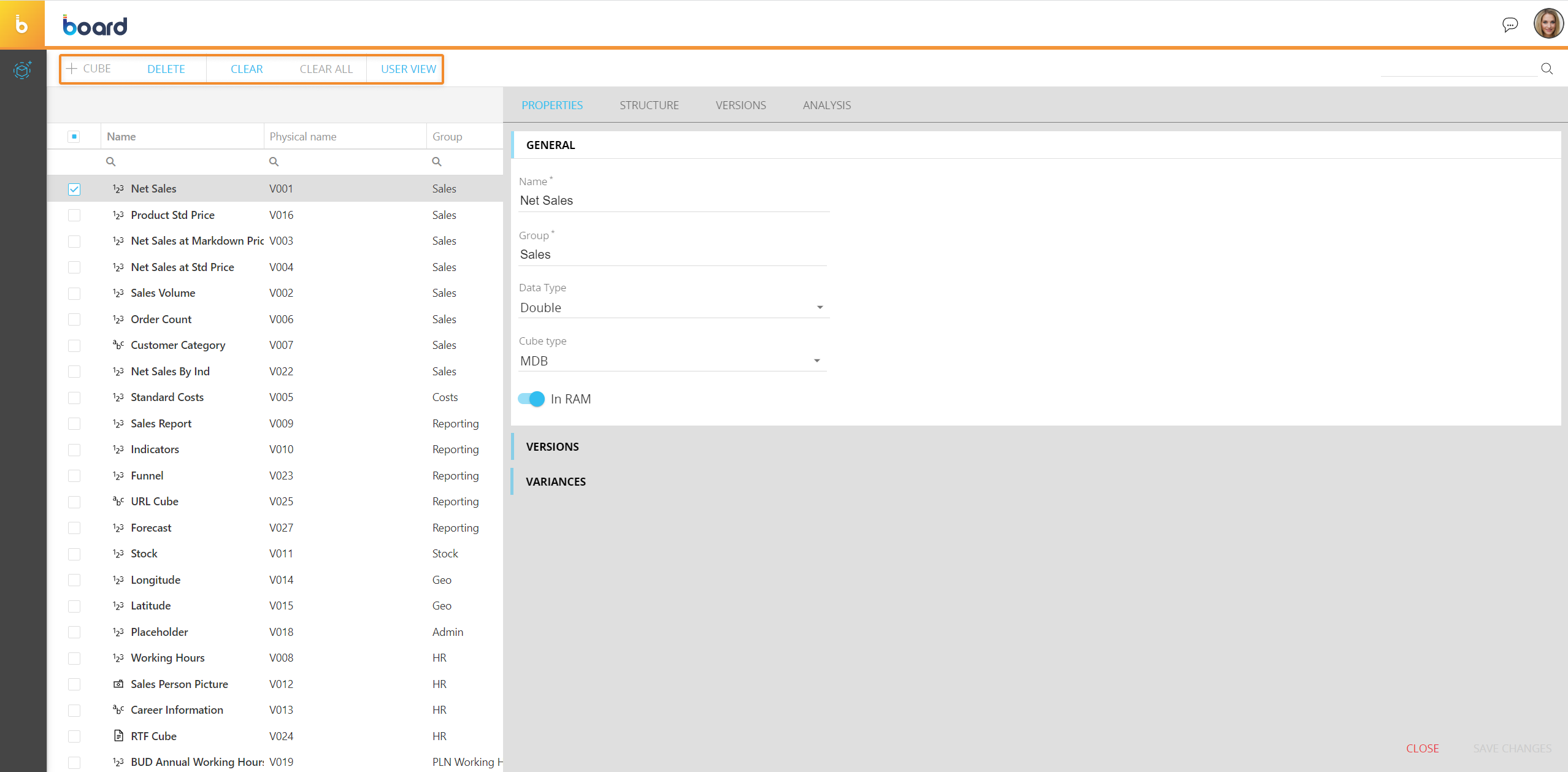 You can perform different actions on one or more Cubes by selecting them and by clicking on the different buttons above the list or by editing properties in the panel that appears on the right.
