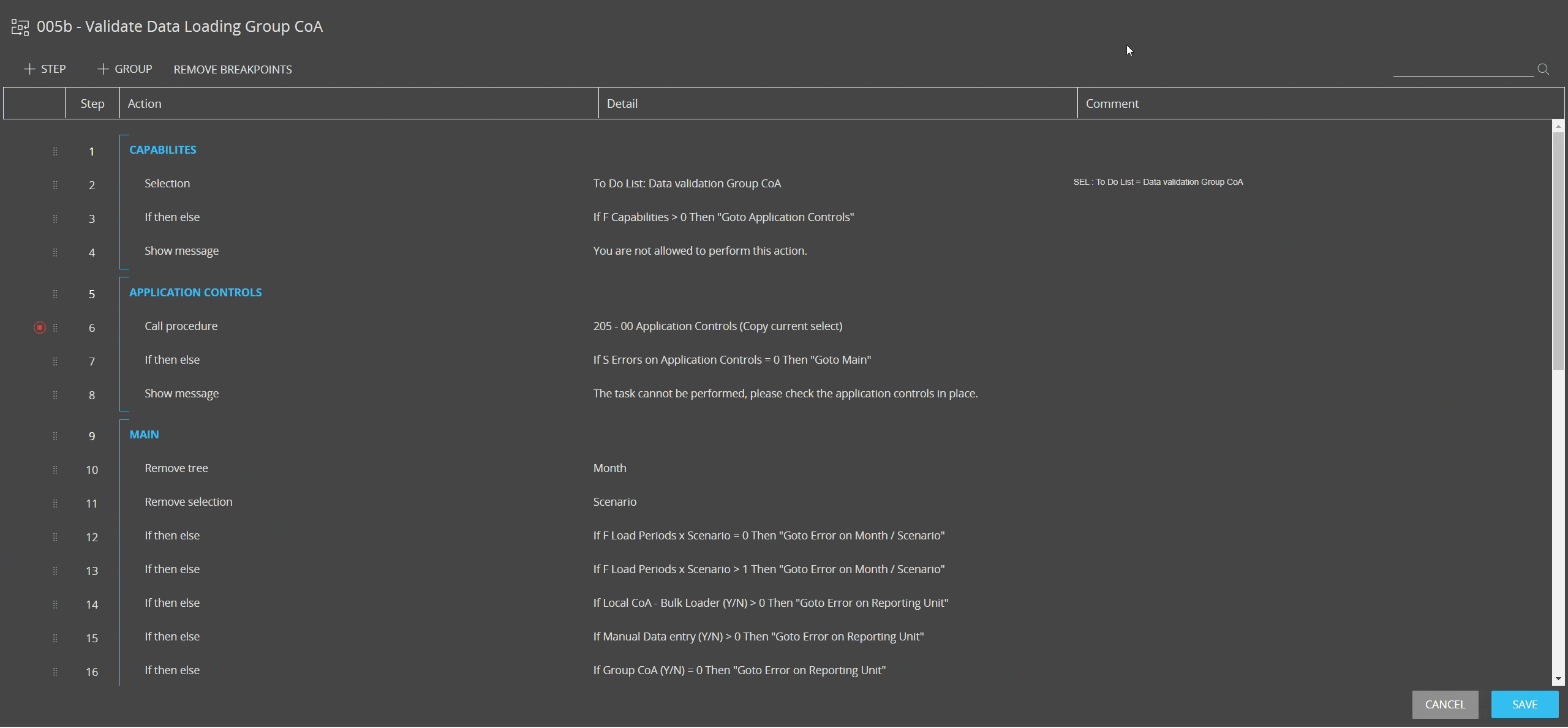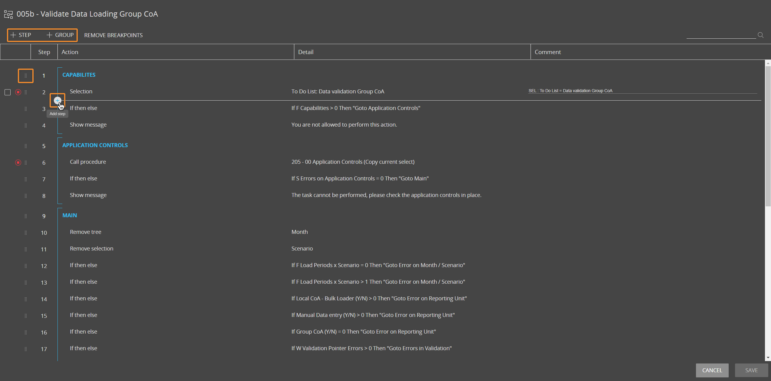 プロシージャエディタが開いたら、[+ステップ(+STEP)]と[+グループ(+GROUP)]をそれぞれ使用して、必要な数のステップとグループを追加します。目的のステップの後にマウスポインタを置き、[+]アイコンをクリックして、新しいステップを追加することもできます。