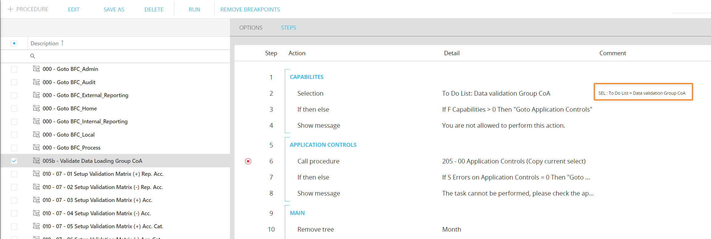 プロシージャエディタでは、各ステップのコメントを入力することもできます。コメントは、ステップの詳細の横にあるフィールドをクリックして入力します。