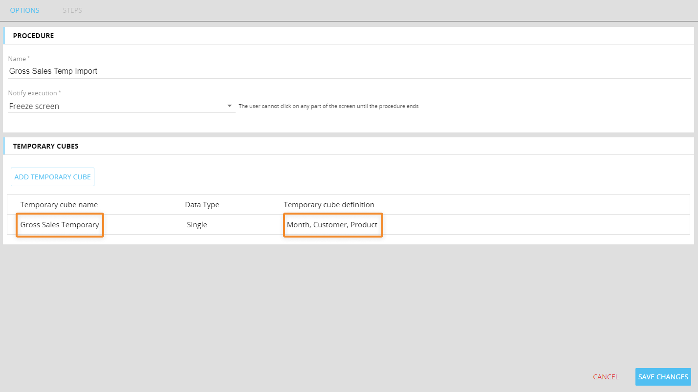 Temporary Cubes in Procedure steps - The use of Temporary Cubes has been extended to all Procedure steps whose configuration includes a Layout or other cube-based options.