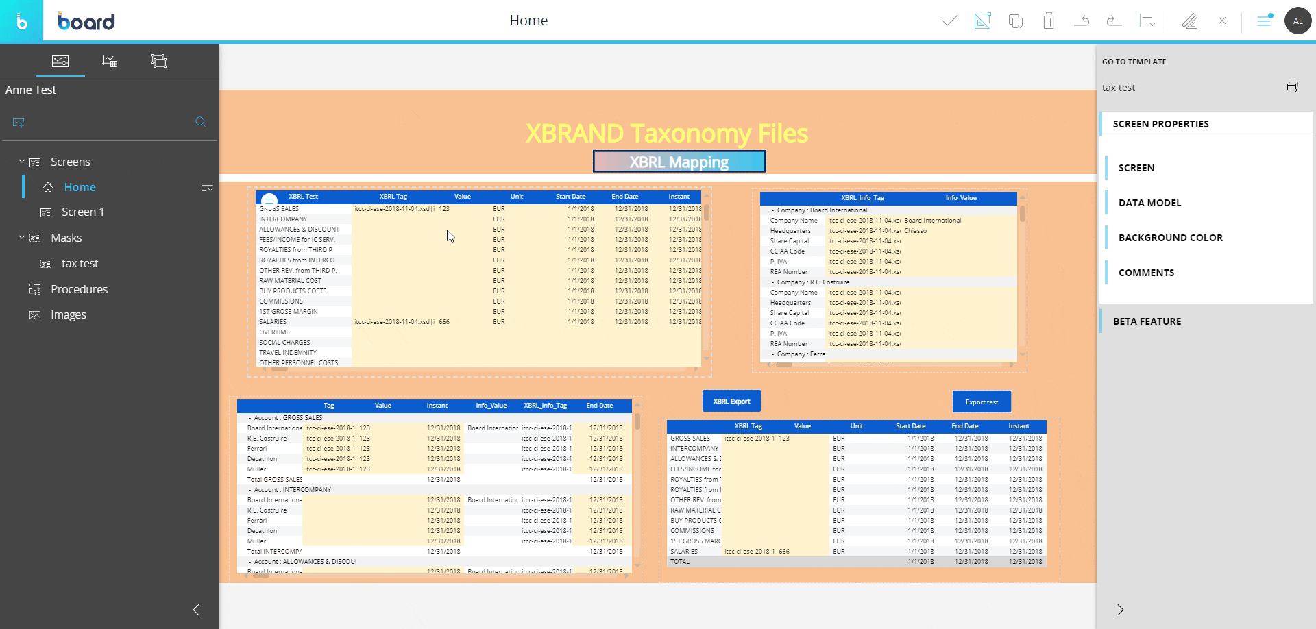 Board allows you to create an XBRL file from a taxonomy .zip file. To create an XBRL file, Board allows users to map data stored in Board to XBRL tags which are retrieved from taxonomy .zip files.