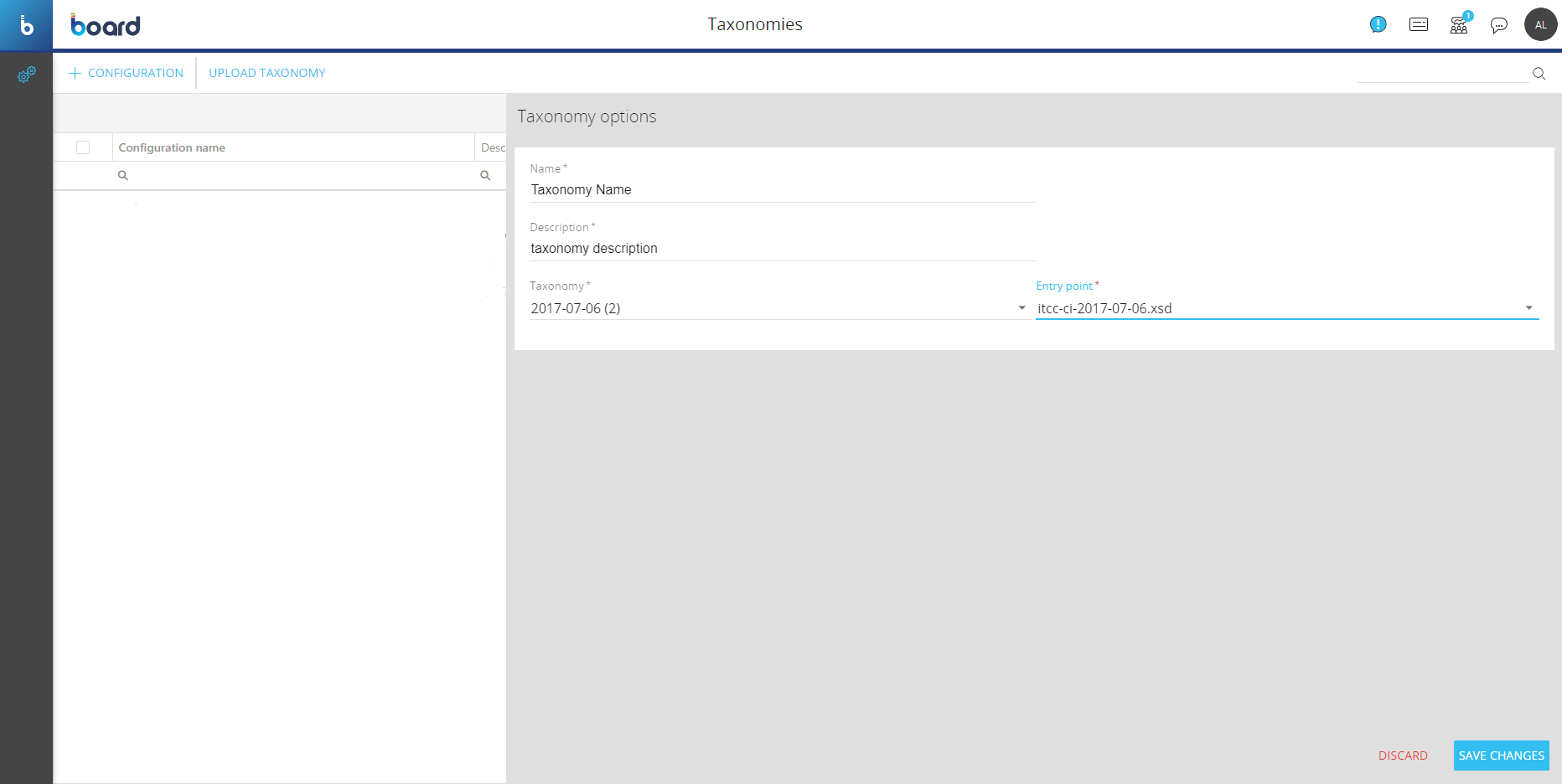 In order to create an XBRL file, you must first upload a taxonomy .zip file that contains the desired XBRL tags to the Board environment.