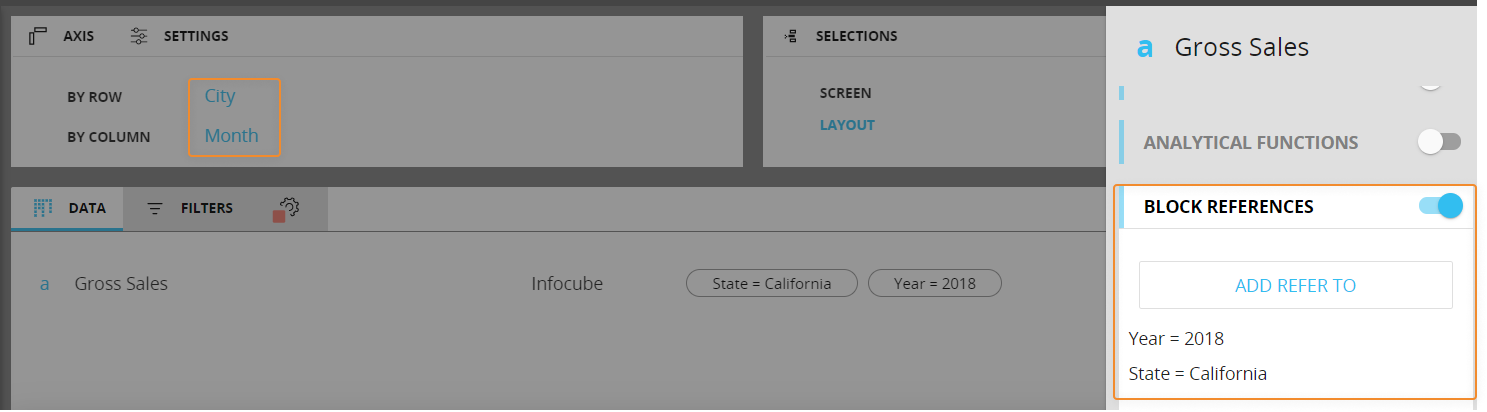 The "Refer to" function can also be used to obtain totals: if you configure a "refer to" condition on an Entity that is more aggregate than the Entities set by row or by column, the function returns the referred occurrence value. For example, if you set a "refer to" condition on the Year and State Entity in a Layout where the Month and City Entities are set by column and row respectively, the function will return the total value for the referred year and state in all cells.