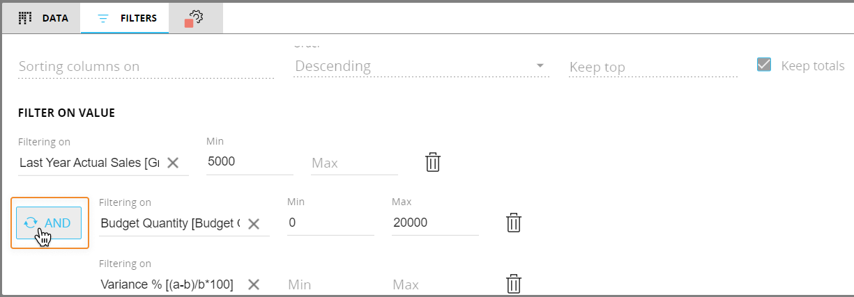 - AND. Requires that all filter conditions are true