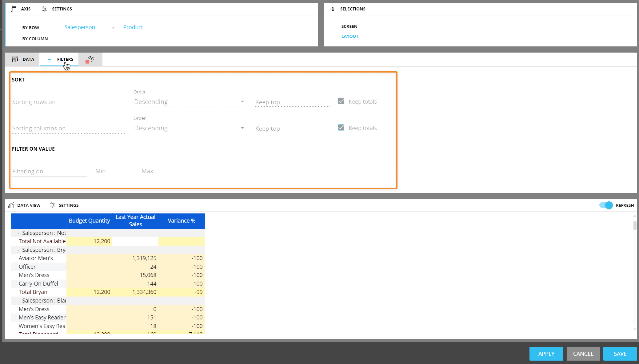 The Keep Totals option, when enabled, calculates totals only for visible rows and columns. If the option is disabled, row and column totals will be calculated considering all rows and all columns defined by the Layout, regardless of their visibility.