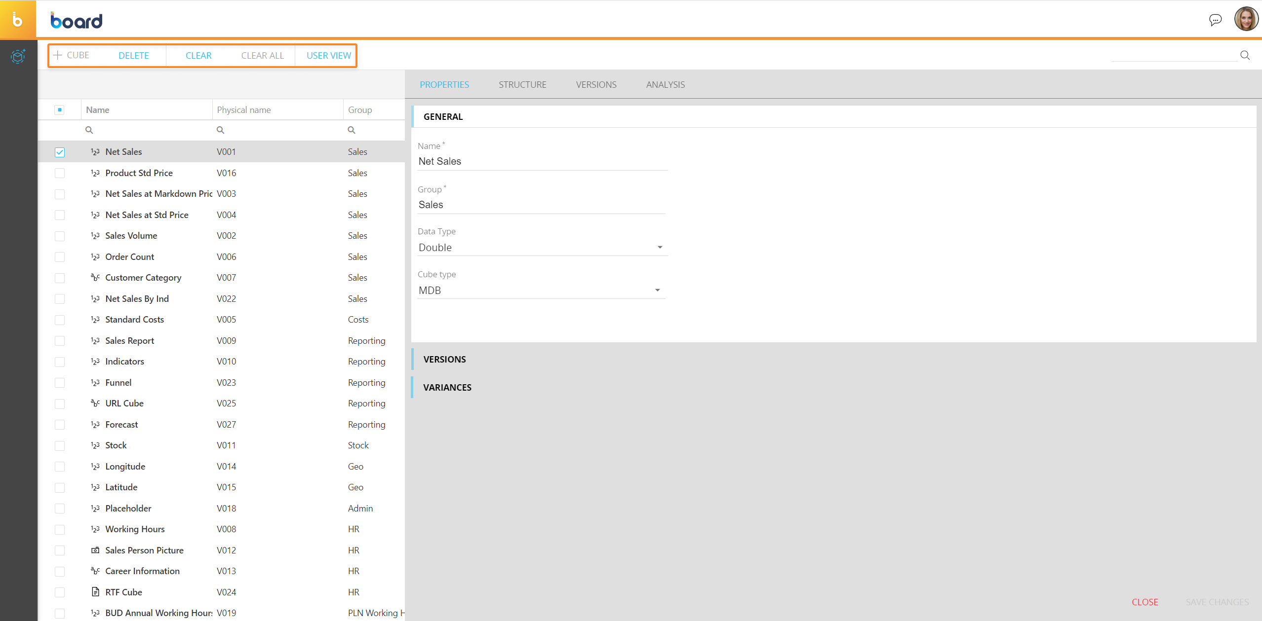 You can perform different actions on one or more Cubes by selecting them and by clicking on the different buttons above the list or by editing properties in the panel that appears on the right.