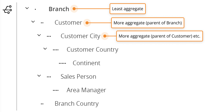 The following illustration shows the "Customer" hierarchy described above, with its three parallel branches.