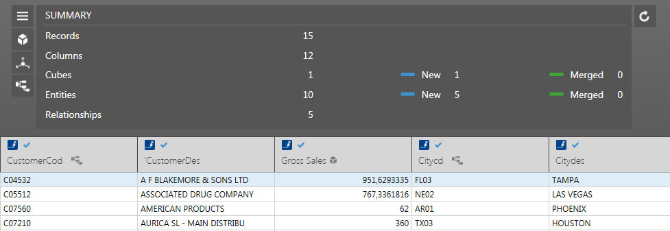 On the top of the Panel an action summary is reported. Clicking on the Left Icon you can shortlist the suggested Objects : info-cube, Entity or Relationships.