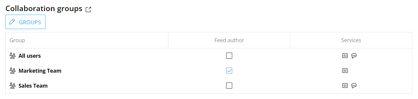 In the "Collaboration groups" table you can review all User groups the user is a member of. Checked checkboxes in the "Feed author" column indicate in which groups the user has been granted the "News author" role. Two icons at the end of the row indicate which Collaboration feature is enabled for each group (Feed and/or Chat).