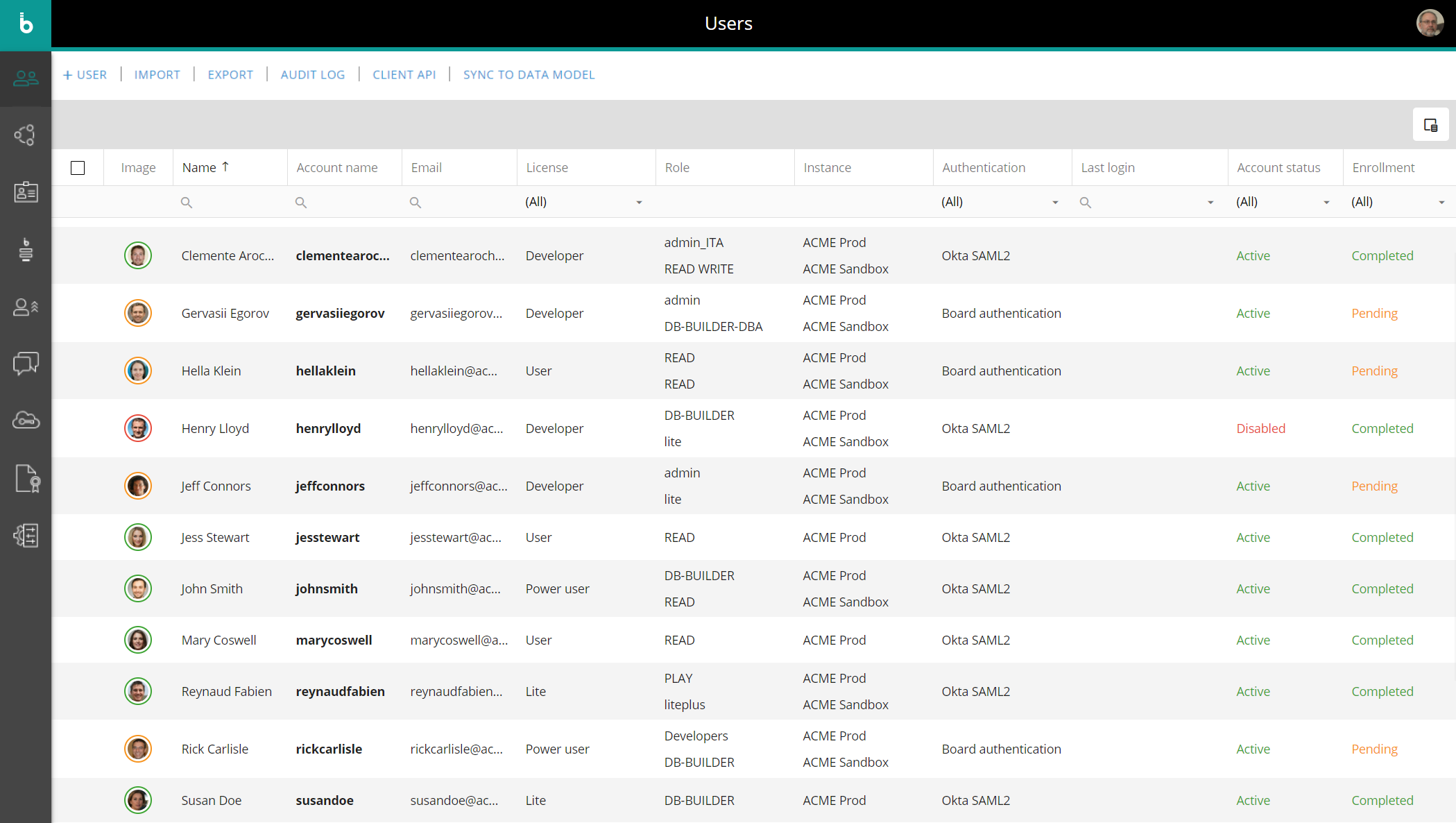 The Users section allows you to create and manage users on your Board Cloud platforms, import users from external files, export users to a CSV file, and set up the authentication data retrieval from Board to external applications and services. You can also configure automatic users synchronization between the Subscription Hub and individual Board Cloud platforms.