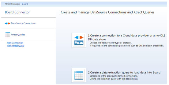 The Query Extract Manager provides an interface to create and manage Connections to Data Providers as well as Data Extract Queries.